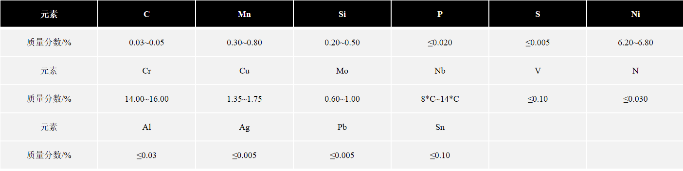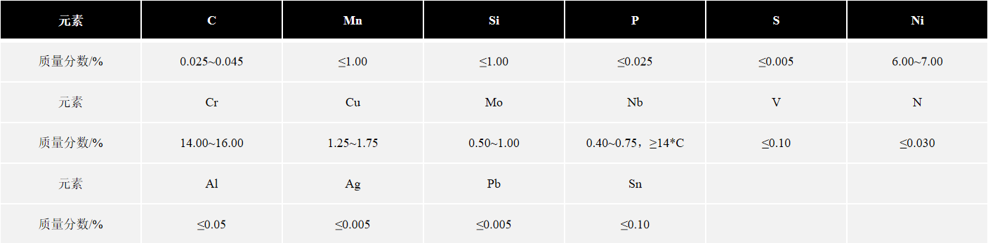 04Cr15Ni7Cu2MoNbVN是 Cr-Ni-Cu-Mo-Nb 低碳马氏体沉淀硬化型不锈钢,主要以低碳马氏体相变强化、碳化物及金属间化合物析出强化,其机械性能主要取决于时效温度。该合金具有非常好的耐腐蚀性能(类似于304不锈钢),具有中等强度(类似于410型不锈钢),650℃下具有优异的抗氧化性,具有良好的可加工性、可焊性。